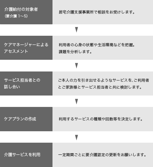 住み慣れた自宅等で安心してお過ごし頂けるよう介護保険の申請からサービスのご案内、ご紹介やご本人、ご家族のご要望をお聞きしながらケアプラン(居宅サービス計画書)を作成させて頂いております。また、サービス提供事業所との連絡調整のほか、継続して在宅生活が送れますようご支援させて頂いております。